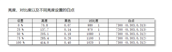 亮度表现相当不错,SDR状态下可以达到414nit,对于游戏显示器来说显然是绰绰有余了。对比度表现也很好,在最常用的300nit左右亮度下可以达到1100:1,属于IPS面板的中等偏上水平。
