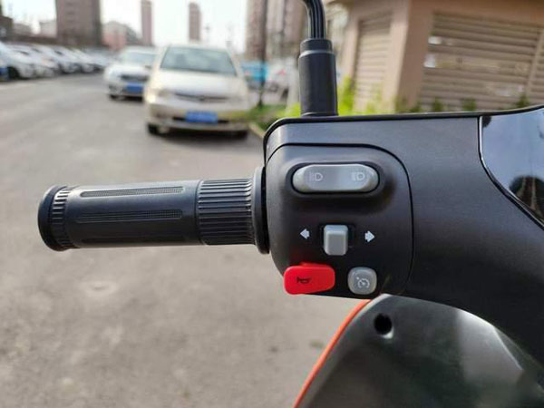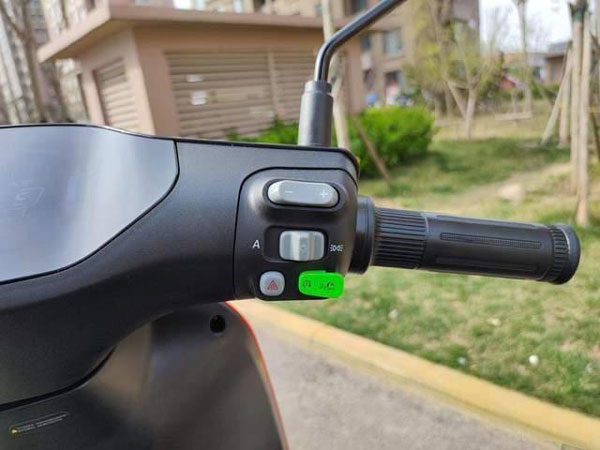 车把左侧组合开关包括远近光灯、左右转向灯、车辆喇叭、定速巡航。这个左右转向灯按钮我倒是第一次在电动车上看到,安全又实用,九号电动车这一点设计的非常人性化。