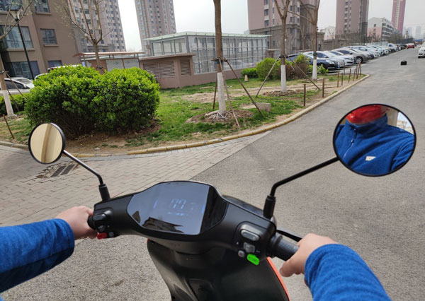九号F90的起步也非常平顺,轻拧油门车子就会缓慢驶出,整个过程非常自然,不会感受到明显的加速。上路行驶过程中感觉还是很平稳的,即使路过减速带或小坑路面也不会有特别明显的震感。整个人坐在上面感觉很轻盈,形容起来就像是人车合一的感觉。轮胎很厚实,而且整车没有异响,非常有安全感。