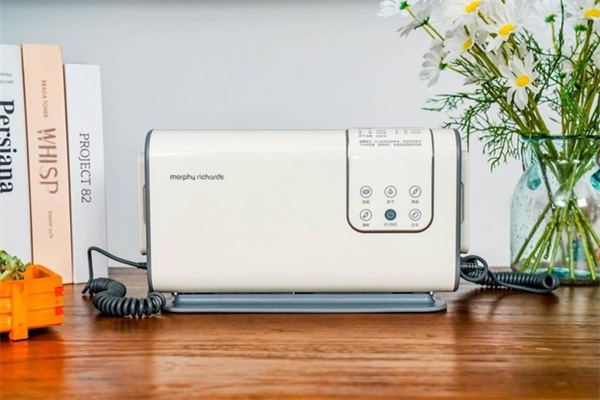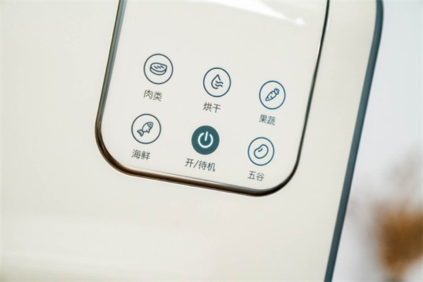 摩飞食材净化机MR2061,整机采用椰奶白配色,可以摆在台面上或者使用配套的无痕挂钩挂在墙壁上,不占空间。工作区采用触摸键操作,分别设有果蔬、肉类、海鲜、五谷四种净化模式和烘干按键,操作简单、方便。