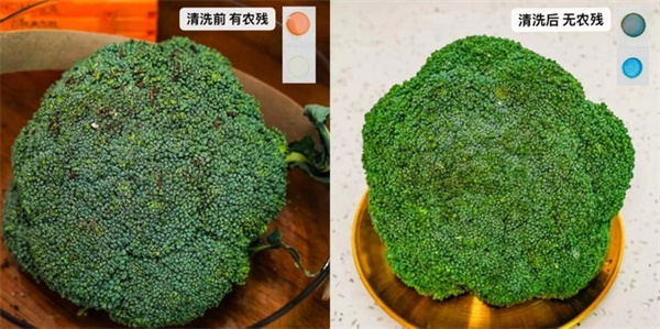 清洗前有农残、有赃物;清洗后无杂质、无农残