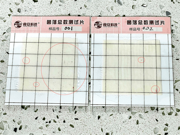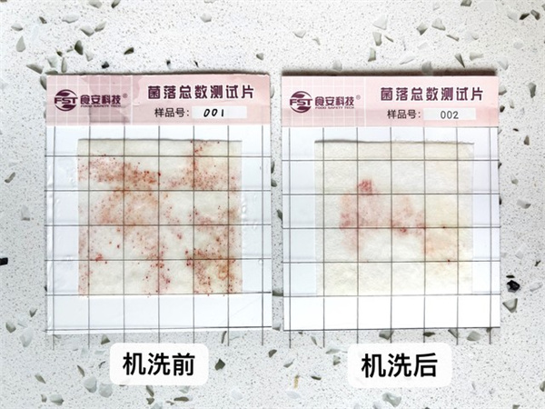 接下来,用菌落测试片对机洗后的小龙虾进行细菌取样,对比小龙虾机洗前后的细菌数,使用生理盐水润湿培养基后,放入恒温36℃的环境中培养16小时,结果是机洗效果非常明显,大部分细菌均被清除。