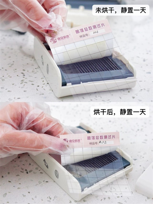 为了测试摩飞食材净化机MR2061的烘干杀菌功能到底有没有必要,将两个清洗仓进行烘干和不烘干两种操作,静置一天后,采用菌落总数测试片对两个清洗仓进行检验。使用生理盐水润湿培养基后,把两张测试片在分别在清洗仓上擦拭,然后放入恒温36℃的环境中培养16小时,实验结果如下:
