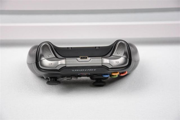Type-C充电口,位于游戏手柄的顶部;这里可以看到设计细节:阿修罗2Pro多模版手柄的肩键,设计了特别的纹理,按压更加舒适。