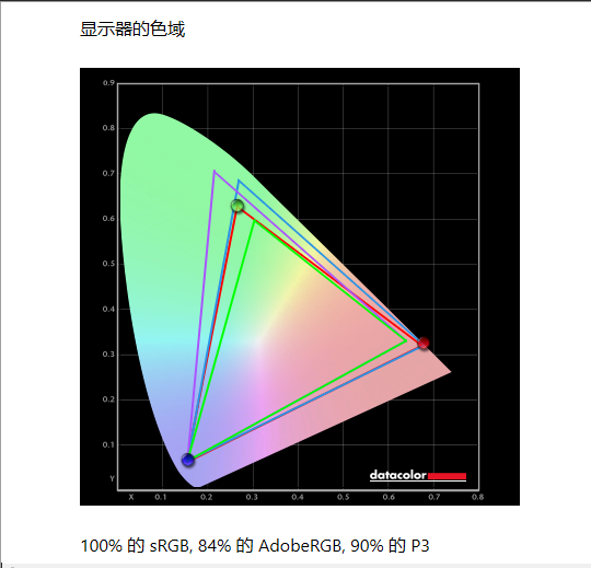 接下来,我们借助Spyder X Elite校色仪对技嘉M28U进行色彩、色准测试,测试前已把显示器恢复出厂设置,并进行一小时的预热。从测试结果来看,技嘉M28U的sRGB色域覆盖为100%(色域容积126%)、Adobe RGB色域覆盖为84%,DCI P3色域覆盖为89%,色域覆盖表现基本与官方参数一致。色准方面,我们采用了48色方案的色彩精准度测试,显示器的Delta E平均值仅为0.61,色准表现非常出色,加上100%的sRGB色域覆盖,使用这款显示器甚至可以胜任一些创作工作。