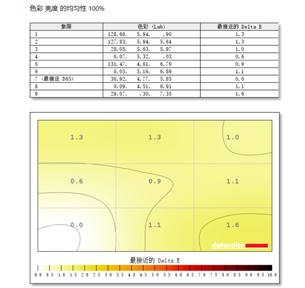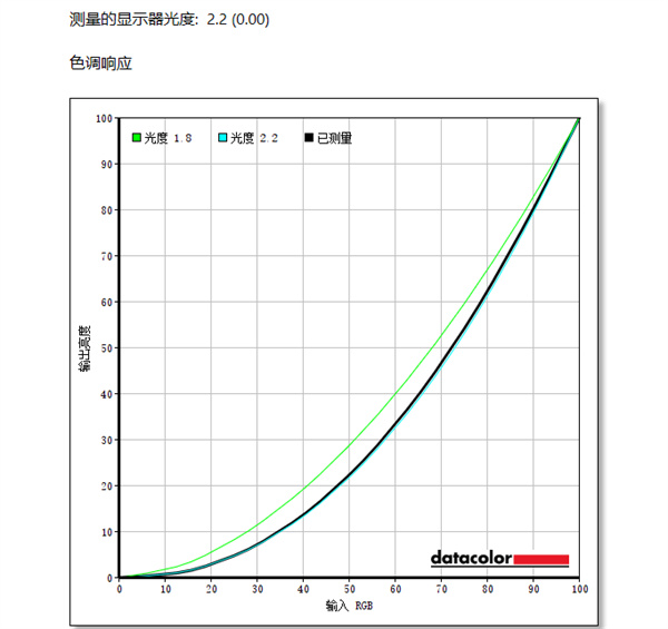在色彩亮度均匀性的测试中,可以看到在100%亮度下,显示器右下区域的第7象限最接近D65标准,其他区域与标准色温值有一定差距,但差异值都在Delta E 1.6以内,平均Delta E甚至不到1,表现非常优秀。色调响应方面,这款显示器的实测色调响应曲线与Gamma2.2曲线重合度很高。我们从屏库中查到这款显示器采用的面板型号为群创M280DCA-E7B,技嘉M28U大概率使用的是原厂背光,因此各方面表现都很稳定。