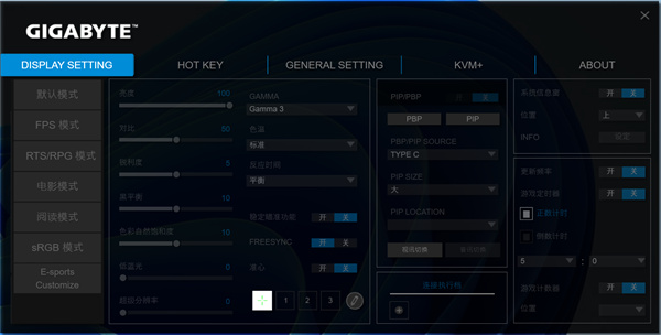 作为一款“战术”电竞显示器,技嘉M28U搭载了多种实用的电竞辅助功能,包括升级版的压枪辅助/瞄准稳定器,黑平衡、自定义十字准星以及计时/计数器等等。玩家也可以用数据线将PC和显示器的USB Type-B上行接口相连,然后在官网下载OSD Sidekick软件。这样就能通过软件直接控制显示器的各项参数、切换输入源、打开KVM、电竞辅助、快捷键等,还可以在屏幕上显示硬件的运行状态,软件支持显示器固件在线升级,操作起来比较便捷。