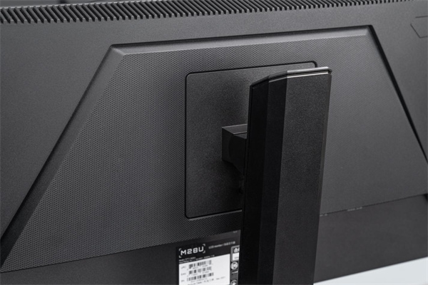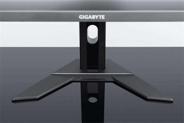 技嘉M28U配备了一个V字形底座,外形上采用了阶梯过度处理,颜值比较高,并且底座占用的空间小,对桌面不大的玩家很友好,给键鼠留出了充足的摆放空间。支架中间设计有椭圆形理线孔,方便玩家管理凌乱的线材。另外,底座本身采用了快拆设计,即使只有一个人也能无需螺丝刀轻松完成安装。