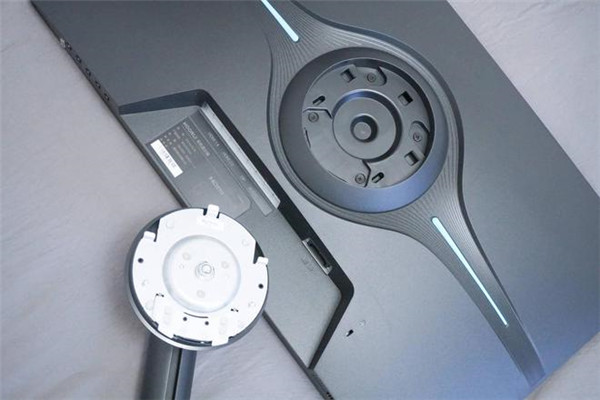 这款显示器的背部,27E1Q Plus显示器整体采用了幻影黑色机身的设计,中间圆形卡盘的位置被称为天使之眸,左右两侧的孔雀蓝饰条点缀的恰到好处,让黑色的机身看起来更时尚了一些,圆形的显示器支架是金刚黑滑面,很粗壮,肉眼看着就很结实。