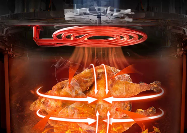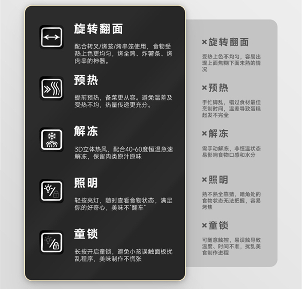 内壁两侧均匀分布着转叉孔和支撑烤盘的几层凸起,我们可以根据需求安装转叉、烤架等配件,配合1500w大功率发热部件,双层11叶的涡轮扇360°热风循环系统,相信多个烤盘一起放置也能充分加热到位,空间利用效率MAX。