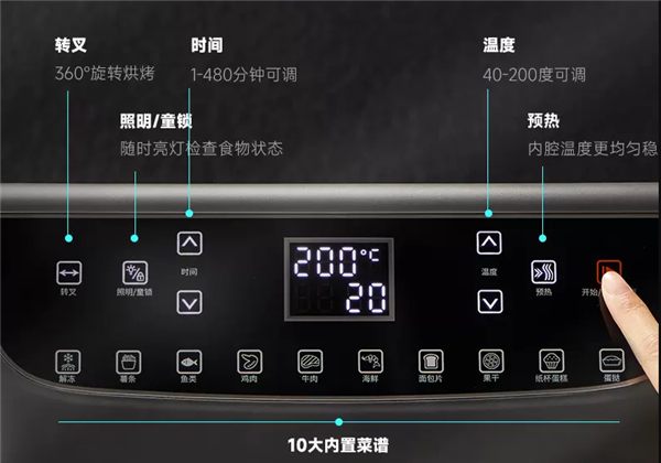 控制面板下方,设置了一排共计九个预制菜单,有需要的时候可以直接使用这些功能,十分方便。童锁按键在显示屏左侧,这个可能可以充分照顾到有娃家庭,避免孩子误触烫伤。