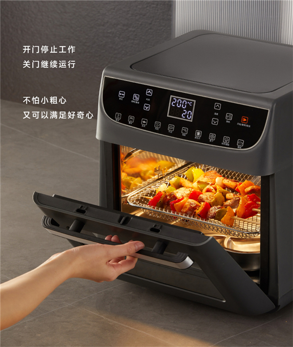 西屋新款空气炸烤箱支持断点记忆功能。在烤箱工作过程中,只要直接打开烤箱门,程序即刻终止,显示屏数字开始闪烁,关上箱门,中断的程序再次启动。无需再次设定温度和时间。这个小功能对于中途开箱添加调料、检查生熟是非常友好的。