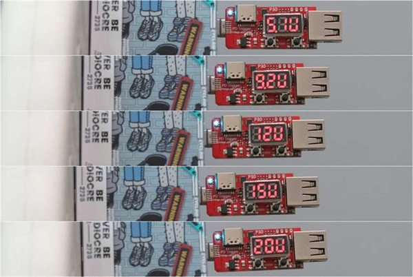 首先测一下电压,5V、9V、12V、15V、20V都能适配,证明CYCLOID鞋盒充电器能轻松匹配上市面上不同的充电协议。