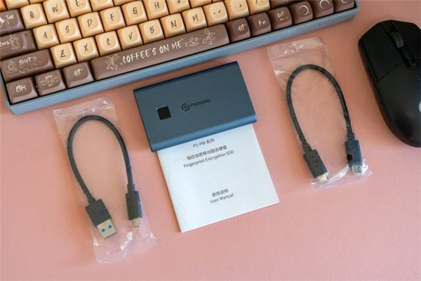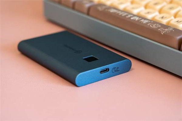 斐数指纹加密移动固态硬盘整体的设计很抢眼,全金属的机身设计,非常轻薄小巧,机身尺寸为93mmx57mmx11.9mm,差不多就是一张普通银行卡的大小。不过机身依然是采用数据线连接的方式连接电脑,并没有内置USB插头,所以外出携带还需要戴上数据线。数据线官方附赠了两根高速数据线,一根为C-C的接口,一根为C-A的普通接口,可以同时支持接入智能手机或者PC端的USB接口,当然,像switch、ps5等最新的游戏机也支持接入,拓展内存。