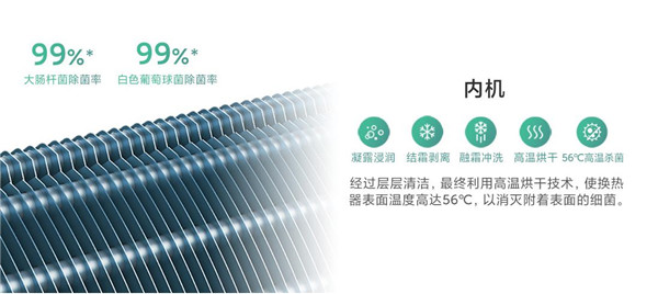 得益于冷热负荷需求自适应预测技术及压缩机驱动自适应判稳技术,压缩机可以高速启动,管翅式换热器提供了充足的换热面积,直径106mm的超大贯流风扇使出风更强劲,循环风量高达680m³/h,实现快速制冷制热。