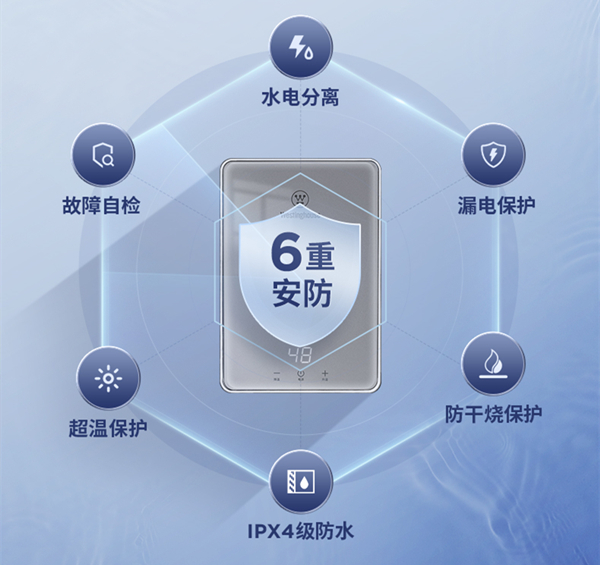 想要保护全家人的用水用电安全,西屋即热小厨宝电热水器时刻带给你安心陪伴,水电分离技术,一体式发热体保护层,加热速度快,食品级不锈钢水管,耐腐蚀,耐干烧,安全耐用,水质更健康,独立的线路层层锁定安全。加热器拥有1500W-5500W五档变频功率,能满足你更多的温度需求,同时更加节能省电,这个冬天让小厨宝给予你美好生活。