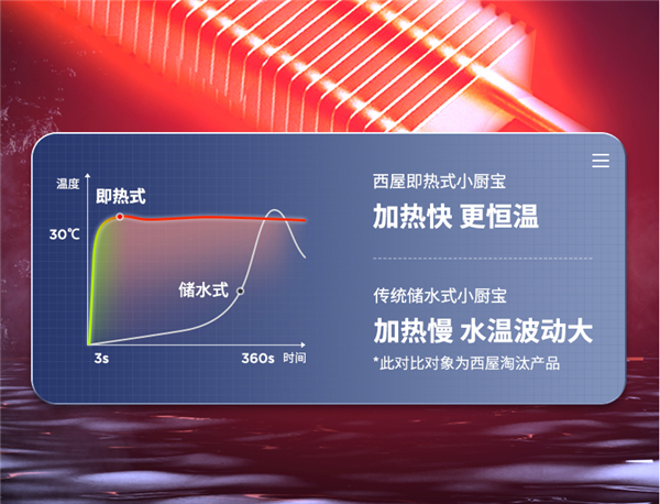 使用传统热水器,热水器常年不清洁导致水质变差,影响家人健康,西屋即热小厨宝电热水器采用活水加热模式,流动水源持续输出,即刻享受鲜活热水,抑菌水更健康,贴心呵护娇嫩肌肤。
