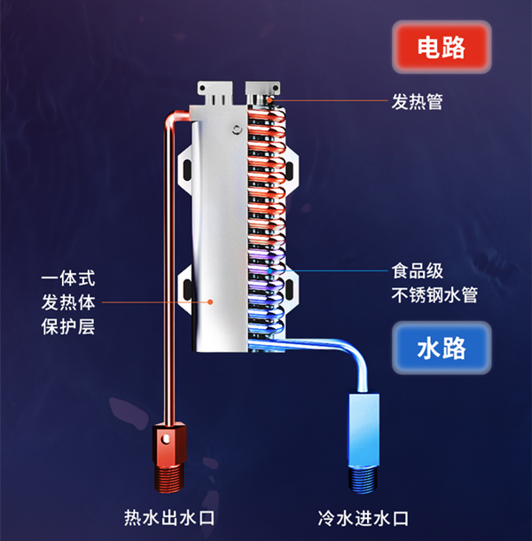 螺旋式铸铝加热体,导热迅速,加大了加热面积,可以快速热水并且水温恒定,配合智慧芯片和专利带防电墙功能的电子恒温阀,可以精控恒温,出来的水温正好,不烫手不冻人,连接水龙头随时打开就是热水,24小时无限量供应。