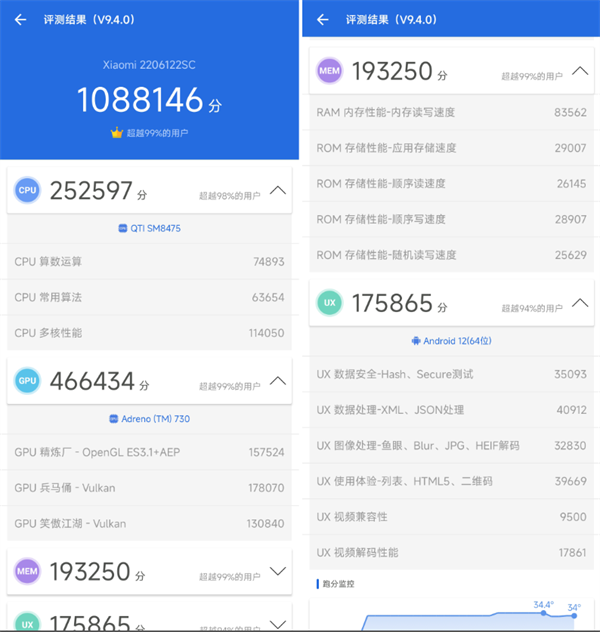 首先是安兔兔综合测试,小米12S Pro轻松就达到了1088146的总分,相较于上一代勉强的1029002分提升明显。从详细的子项来看,CPU性能变化最大,提升高达10%。