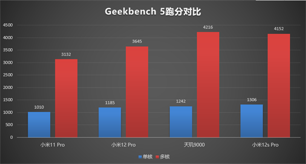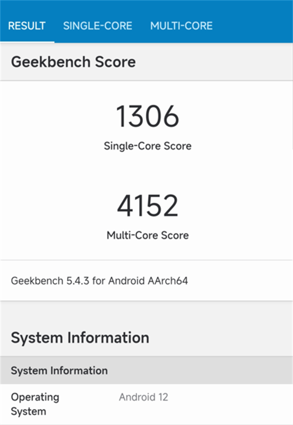 Geekbench 5测试,单核得分1306.多核得分4152.单核超过了天玑9000.多核相差也只在5%以内。