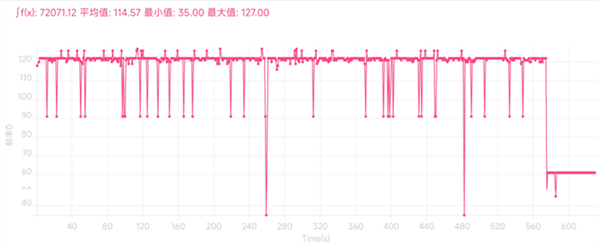 《王者荣耀》支持最高画质和120帧模式,开启后游玩将近10分钟,平均帧率114.57 FPS,帧率波动不大。
