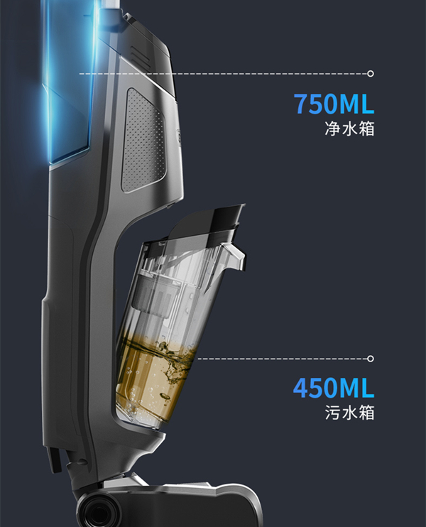 既然是洗地机,用水自然是必不可少的,清水箱位于机器的后侧上方。清水箱的容量有750ml,大面积洗地也够用,不用频繁加水。不同于一般洗地机清水箱的平面设计,360洗地机的清水箱是有弧面的,尤其是上方有一个类似腰身的收口设计,手拔水箱的时候刚好可以握住,不会打滑。