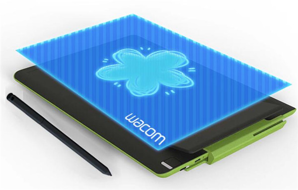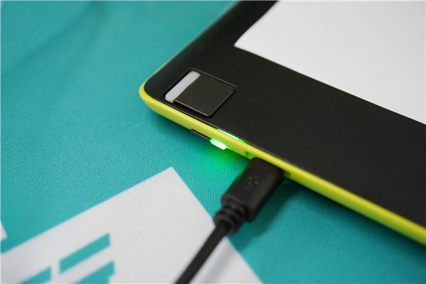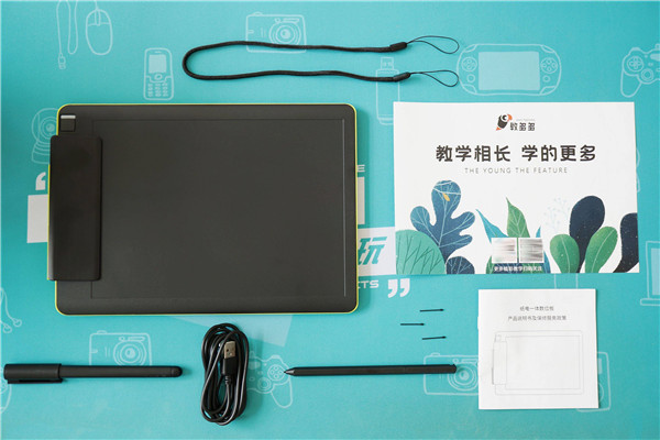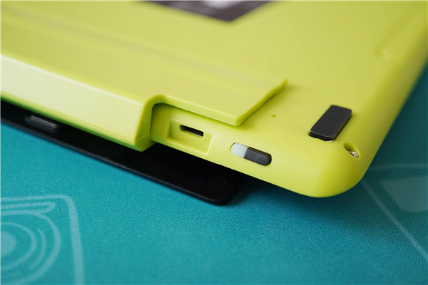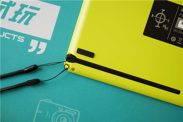 手绘板的背面采用的荧光绿,并配备了一个电子手写笔的插槽,电子手写笔可以通过笔绳与主机连接,不用时插入插槽,无论是对外带、抗遗失、保护笔尖还是收纳规整都有益处。