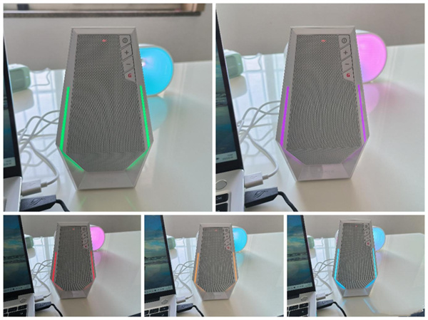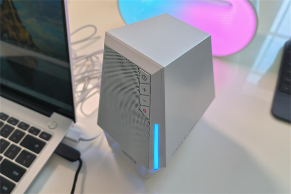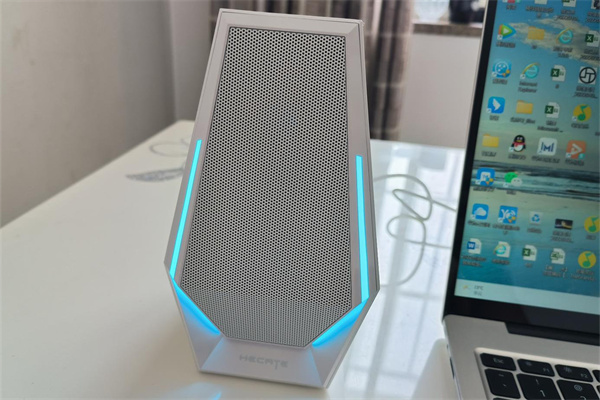 这款G1500游戏音箱秉承HECATE漫步者电竞的家族设计风格,造型科幻,极具机甲风。笔者上手的白色、磨砂质感,整机设计非常漂亮,正面采用不规则六边形造型,线条打造棱角分明。