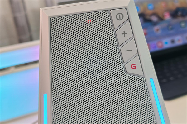 面板采用高品质铁网,而且面板采用10%黄金倾角设计,据说日常大家坐在桌面上喇叭向着你的耳朵的角度刚刚好是10° 这样声音的声波就不会有折射直接到达你的耳朵,更加符合人机工学。