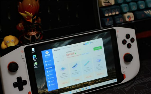白色的OnexPlayer mini搭载的是AMD 锐龙7 5800U处理器,内置有AMD Radeon RX Vega 8核显,内存是16GB 双通道内存(4266MHz),容量方面是500GB固态硬盘,7英寸的触摸屏,分辨率为1280*800,简单来说,这就是配置最低的OnexPlayer mini,我使用鲁大师跑了个分,得到了884316分,这性能比switch强很多吧?