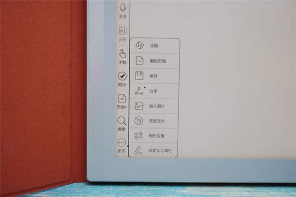 进入笔记,可以看到文石Note X丰富的书写功能图标,比如图层、画布、图形、套索、缩放、文本、录音、识别、手触、同步、页面、搜索等。