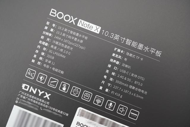 文石Note X采用黑色翻折式包装盒,正面的产品slogan和品名只为亮黑色,只在特定视角才会显示内容,整体质感还是很不错的。背面则包含了产品参数、主要特点和厂商信息等内容,参考意义比较大。