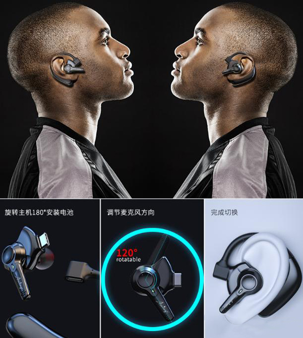 艾米尼UFO4无线蓝牙耳机采用人体工学设计,拥有流畅的曲线,极贴附耳廓,这样的设计能使耳朵受力均匀,带来久戴舒适不易疼痛的效果,且佩戴稳固不易掉落,跑步运动时也不怕震落,挂耳采用柔性回弹材质,不仅稳固还不易老化,用久了也不易开裂,并且在佩戴时会自动回弹贴合耳背。另外它还以右左耳互换佩戴,只需要旋转主机180°安装电池,再120°调节麦克风方向,即可完成切换。