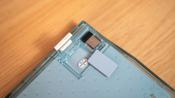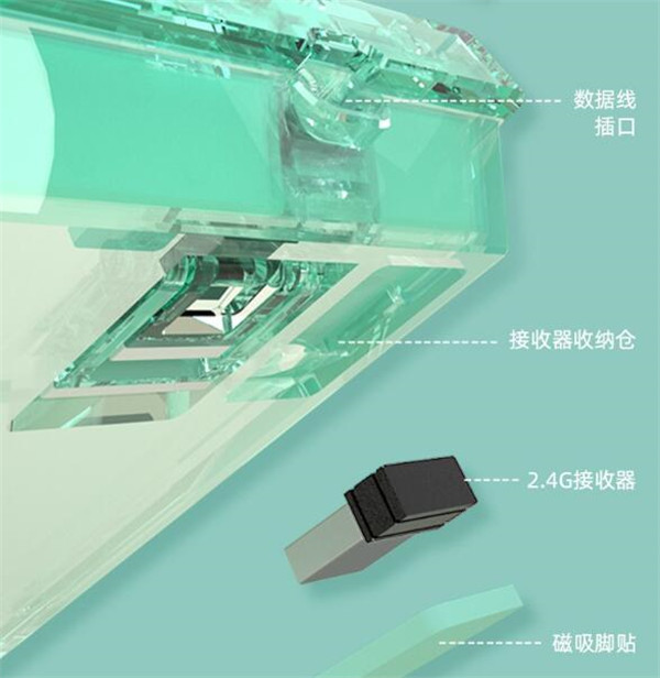 值得一提的是在底部的左上角有一个磁吸脚贴,打开脚贴后可以将2.4G无线接收器放入其中进行收纳,在日常非无线模式下可以将接收器方便放置其中。