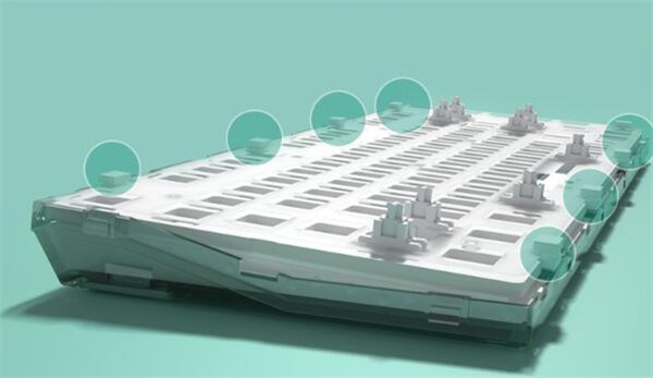 在大按键上,使用了卫星轴设计,每次按下空格以及shift等按键时也不会出现按键松散的情况。