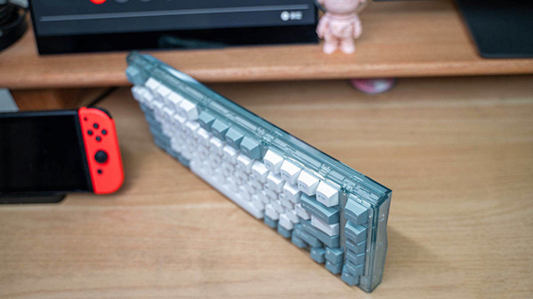 尺寸方面,腹灵Q75机械键盘很小巧,长宽高为330*142*30mm,仅仅比我的Macbook Air宽一小截,放在桌面特别省空间,日常不使用的情况下,往木桌架一塞就完成收纳,而且作为一款三模机械键盘,腹灵Q75机械键盘可以完全做到不受线材束缚的烦恼。
