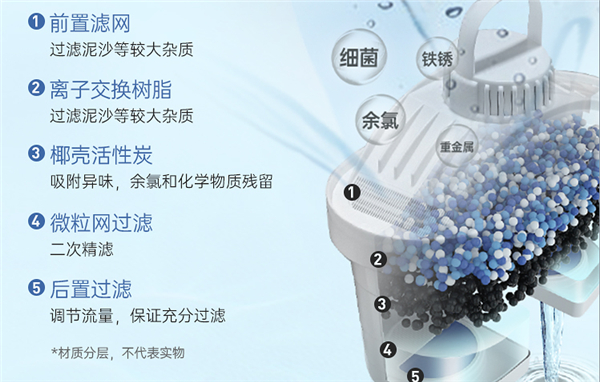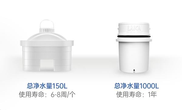 这两个滤芯中双导流高效滤芯是体积较大的这个,有两个出水口,它首先过滤掉水中大颗粒的杂质,像是水垢、余氯、重金属等,较小的微生物阻断滤芯,主要用于去除细菌,可以保留水中矿物质离子活性,它的过滤精度为0.1微米。两个滤芯的有效寿命不同,初滤的双导流高效滤芯可以过滤150升水,能用两个月左右,超滤的微生物阻断滤芯能过滤1000升水,大约能用一年,要想保证净化质量,滤芯需要定期更换。