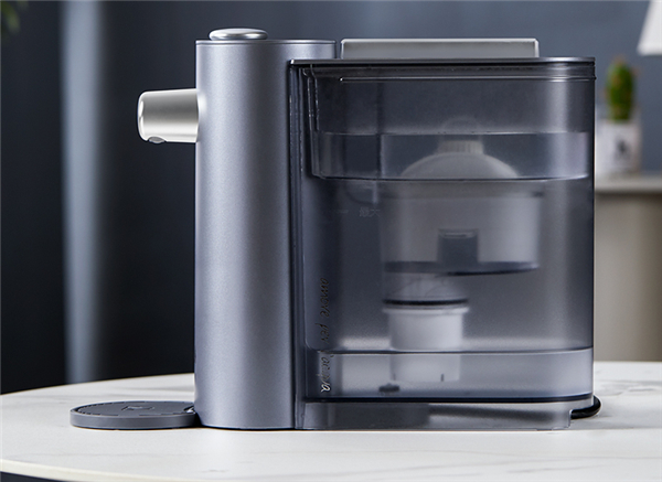 在结构上,这款莱卡KE9010台式净饮机的主体部分可以起到加热的功能,滤芯则是安装在水箱里的,这样拆卸更换会很方便。在净饮机的主机上,主要有一个旋钮和一个出水口,它采用了圆柱形的结构,侧面的出水口接水非常方便,并且配备了一个磁吸式的杯垫,防止热水溢出后洒在桌面上。