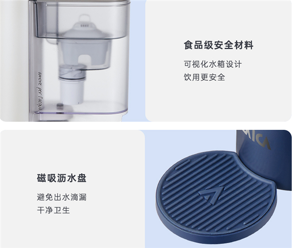 莱卡KE9010台式净饮机的水箱采用了食品级材料,箱体为半透明设计,里面的过滤进度、水量清晰可见,外层为磨砂手感,防滑效果不错,装好滤芯之后,再往水箱里倒入适量自来水,等待滤芯完成过滤后,净饮机就可以正常使用了。净饮机的水箱上还有个防尘盖,闭合紧密防尘表现较好,同时开合也很方便。