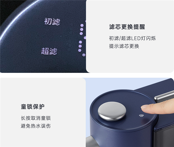 莱卡KE9010台式净饮机主机部分的顶部有一个显示屏,除了需要用旋钮操作之外,上面还有三枚触控键,其中童锁键是经常要用到的,每次使用前要先解锁,避免因为误操作而被烫,解锁后1分钟不操作会自动锁定。另外还有两枚初滤和超滤,对应两个滤芯,滤芯到期需要更换时会通过这两个按键进行提示。