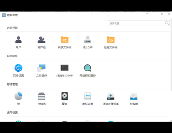 从控制面板中,可以得到更多的技术支持,这种分层形式特别简单移动,感觉要比windows的系统设置直观明了,建议微软官方学习一下!设置的内容比较全面,可以对访问权限,网络以及尺寸设备等进行管理,也包含对于NAS的基础设置进行调整。