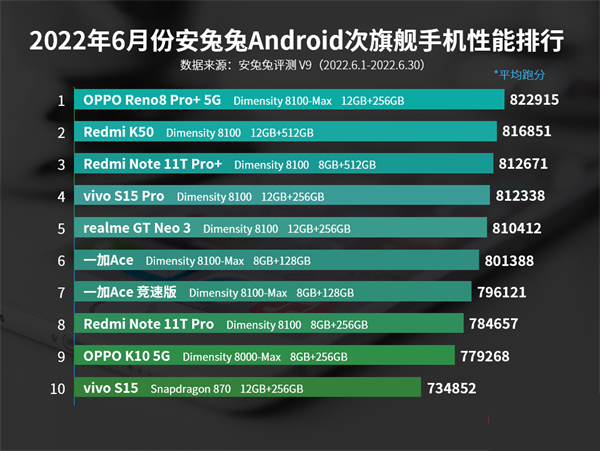 骁龙870、天玑8100、天玑1200等处理器归为次旗舰。次旗舰榜单已经被联发科占据,天玑8100几乎完成了霸榜,下面我们就一起来看看2022年6月安卓次旗舰手机性能排行榜。