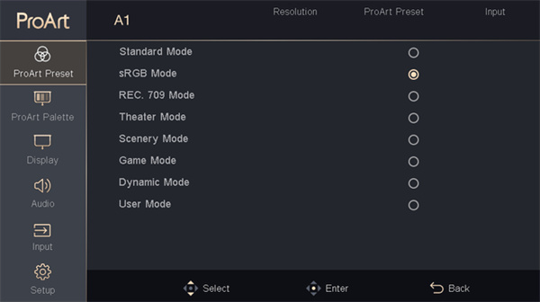 对于专业显示设备,就不得不提其画面调校相关的功能。华硕ProArt Projector A1提供了标准模式、sRGB模式、Rec.709模式、剧场模式、风景模式、游戏模式、动态模式以及用户自定义模式在内的8种画面模式,用户可以通过远程设置和热键轻松地在这8种模式之间切换,非常符合全能职场人多面手的需求。