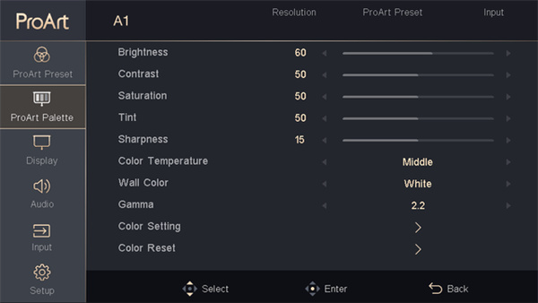 此外,华硕ProArt Projector A1还提供了ProArt 调色盘工具,除了基本的亮度、对比度、饱和度等功能外,还有六轴色相/饱和度等相对专业的高级设置,让使用者进行颜色管理更加方便。在展示作品时,便于将华硕ProArt Projector A1投影仪设置成与所用专业显示器相同的参数,从而保证画面颜色的一致性。