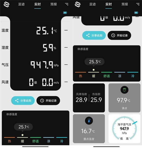 气象仪内置高精度气象传感器,温度(-20~50℃)、湿度(0%~100%)、气压(300~1100hPa)、风速(0~40m/s)四大气象数据实时监测,高精度指南针准确定位户外方向,以备出行不时之需。秒级更新频率瞬时气象掌握、营地天气预报让户外天气有保障。此外还有体感温度、风寒指数、热指数、沸点、露点温度、海平面气压以及位置(经纬度、海拔)的信息显示,很是贴心实用。