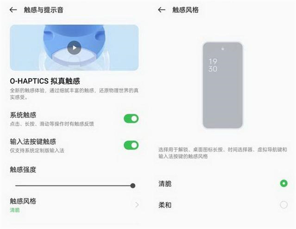 要开启这一功能,可以在OPPO手机的系统设置中找到触感与提示音选项中,进行开启。从选项上来看,具有清脆和柔和两种风格可选。