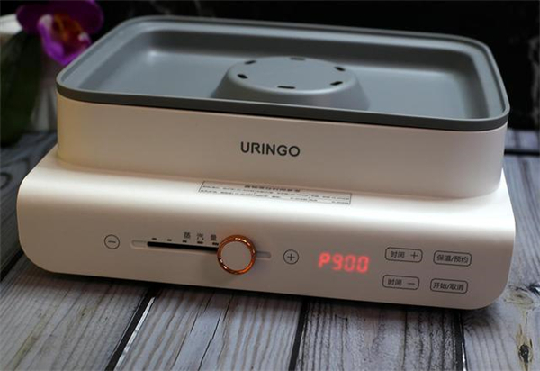 底部的操作区域左侧是一个滑动扭,可以左右滑动调节点蒸锅的蒸汽量,最大功率900W,我们可以根据需要进行选择。带有智能控温保护,可实现缺水自动断电,防止干烧。