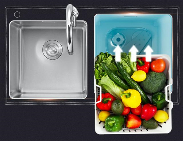 以上两款产品都是台式洗碗机,下面这款是水槽洗碗机。方太洗碗机CJ03不需要动橱柜,3小时就能轻松换装水槽。不但如此,它做到了一机三用,既能作水槽,又能作果蔬海鲜清洗机,还能做洗碗机。与此同时,它与厨房水槽浑然一体,极大地节省了空间资源。