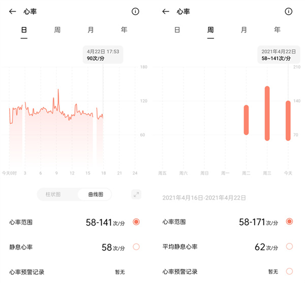 不过一加的APP界面比较特别,额外提供了曲线图和柱状图的切换选项。前者更注重心率的变化,后者更注重心率的高低,可以用不同的统计图形式来进一步加深对于数据的理解。