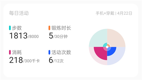 一加Watch会统计用户一天的活动量,并且设定目标,用饼状图的形式显示出来。每日的步数、锻炼时间、消耗卡路里和活动次数都有要求,通过明确的任务目标来鼓励用户维持健康的生活习惯,保持身体的锻炼。